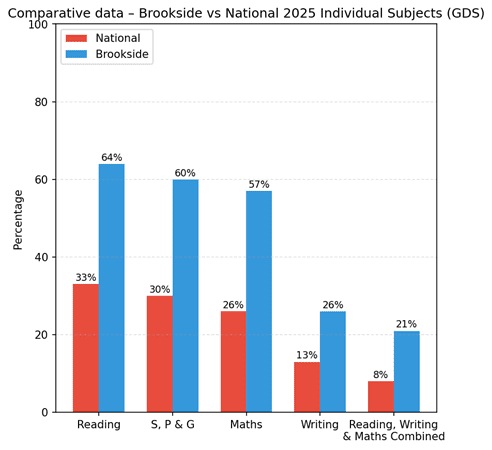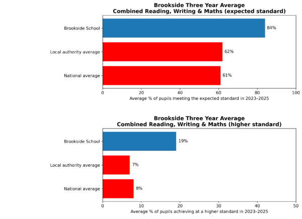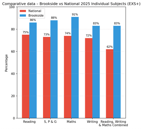 At Brookside, the % of pupils achieving the expected standard of attainment in combined reading, writing & maths is 83% (the national is 62%).